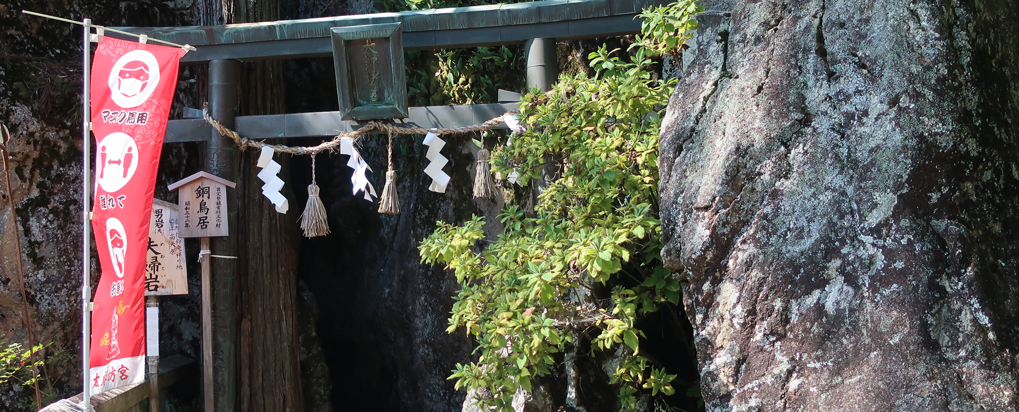 今年も新型コロナ禍なのでのぼりで3密対策をうたっていました。この鳥居をくぐって進んでいきます。